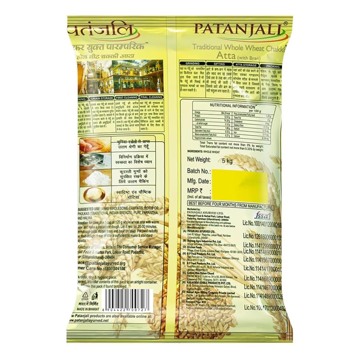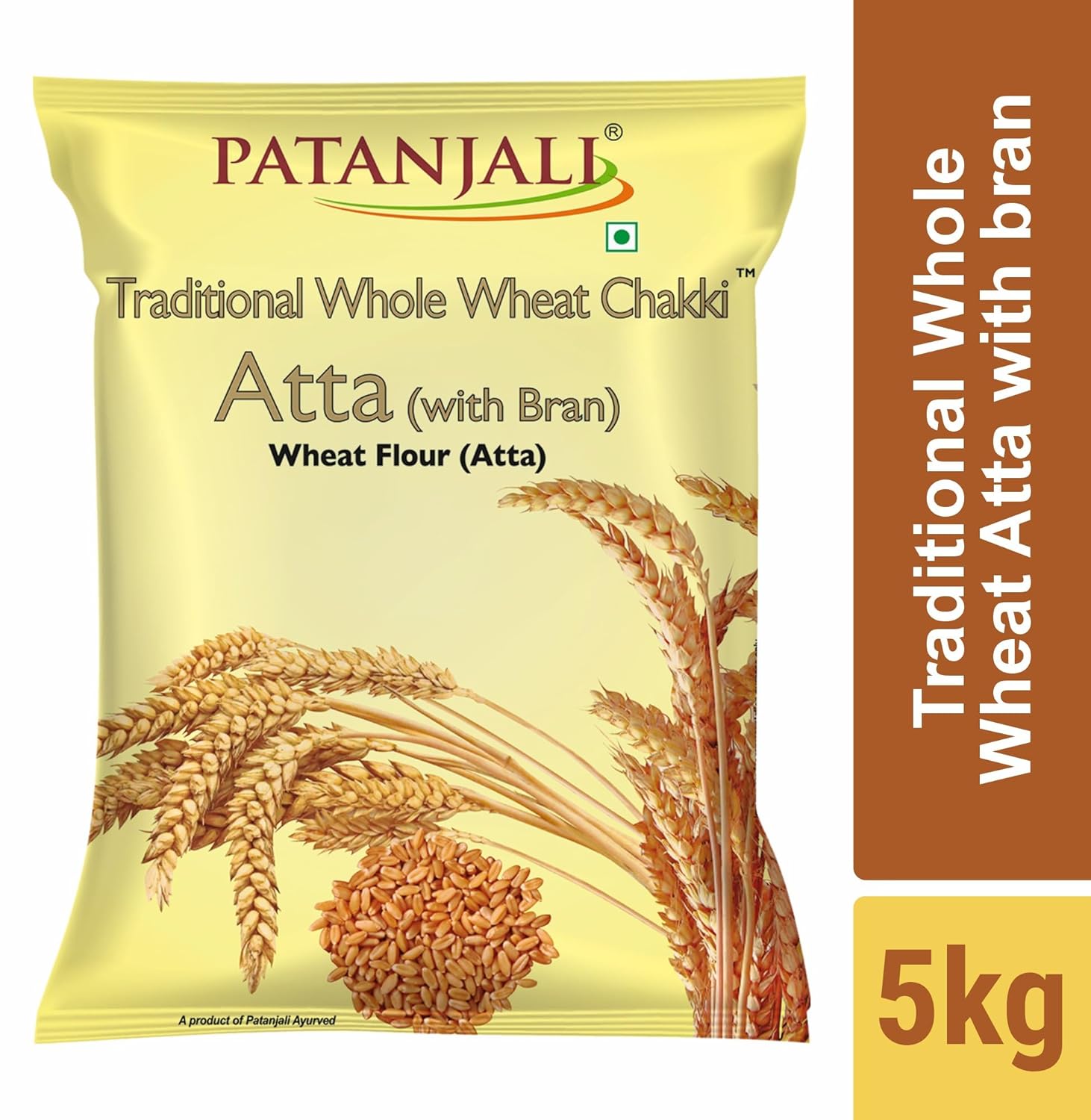 Patanjali Traditional Whole Wheat with Bran Chakki Atta is more nutritious as it contains whole wheat with bran, The hard outer covering of the wheat grain, called bran, contains vitamins B12 and D that are beneficial for your health. Bran is also low in fat and high in dietary fibre to keep you healthy. Whole wheat flour is also rich in complex carbohydrates and is beneficial for diabetic people. Use it to make soft, fluffy, and delicious rotis and phulkas.